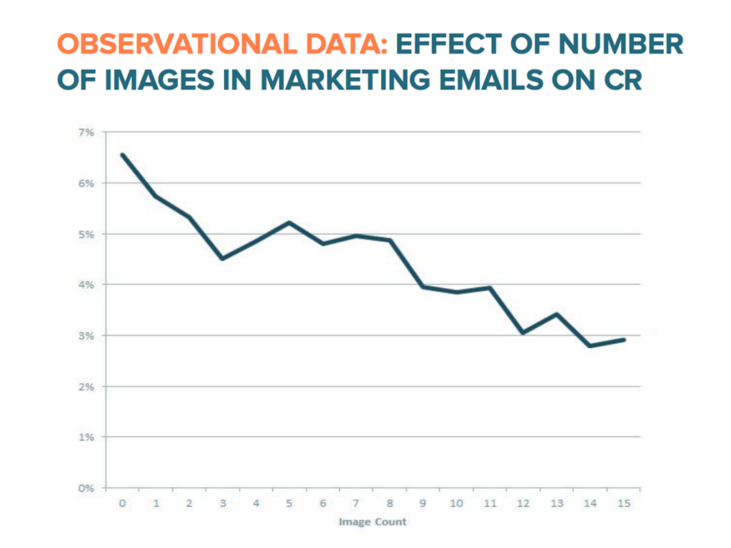 For HubSpot's last test, they compared the click rate of emails based on the number of images within. While there are a few dips and rises, the trend is clear: more images equals less conversions. But why is this? After all, images on social media perform much better than just text posts and are generally considered to be "click magnets."